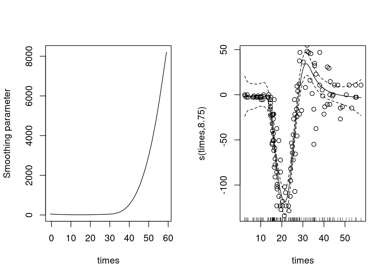 }The following plot shows this relationship alongside the smoother for comparison. What we can see here is a very small decrease from the starting value of the penalty (due to our increased uncertainty at the “edges” of the data), then a massive increase in the penalty around 30-40 ms. This increase coincides with a much larger range of data in the plot on the right. When the data is more varied like this, we need to increase the penalty value to ensure that the smoother does not try to fly off and visit all of the points.
