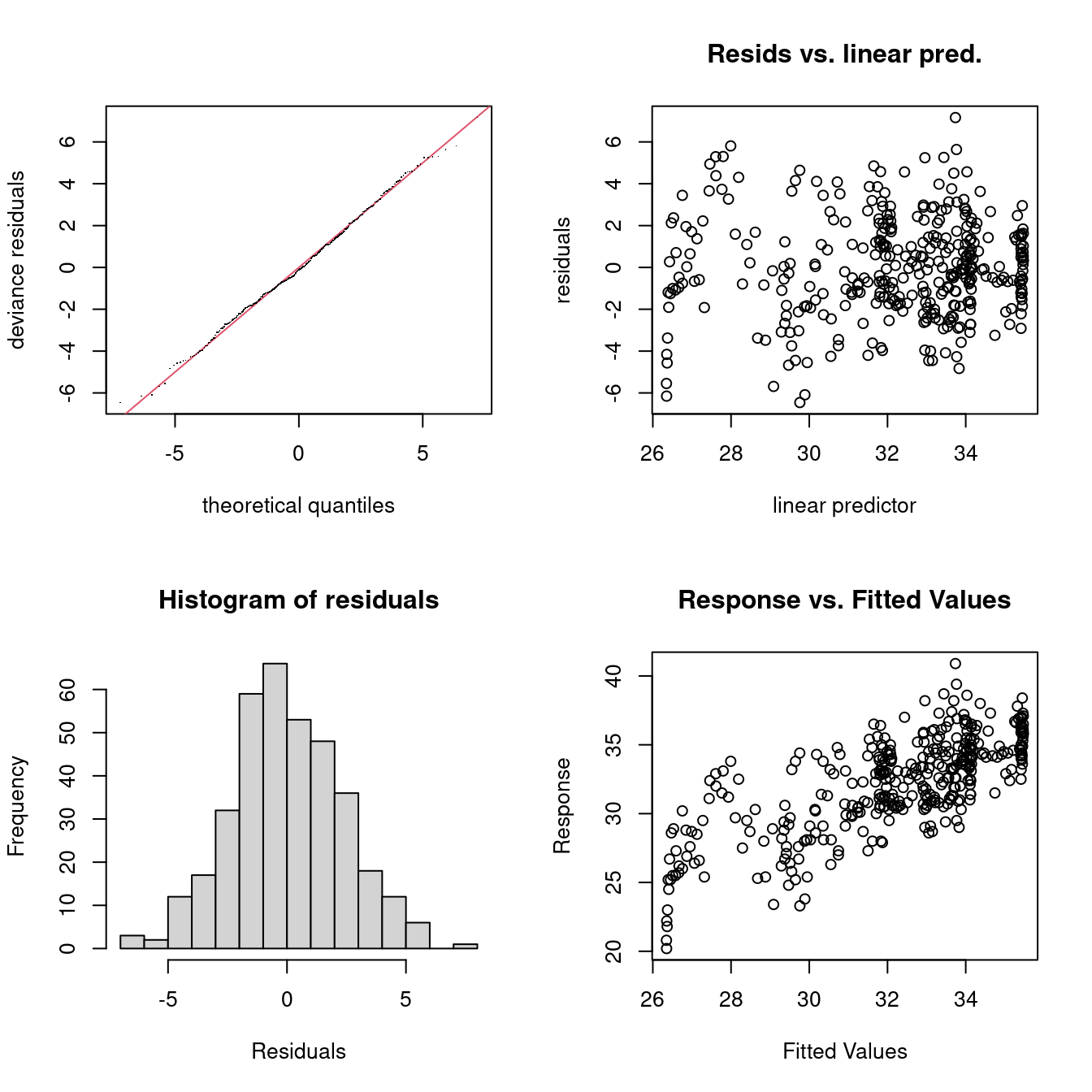 Note that I’ve bumped-up the maximum basis size. I could have increased it a lot more for this basic GAM, since it’s trying to fit to all that variation in the data. This is one of the many issues with fitting a “simple” model to this kind of high-resolution time series data – our usual ideas of how to increase complexity don’t make sense. We want to get to the underlying pattern for the year, rather than getting hung-up on short-scale phenomena.