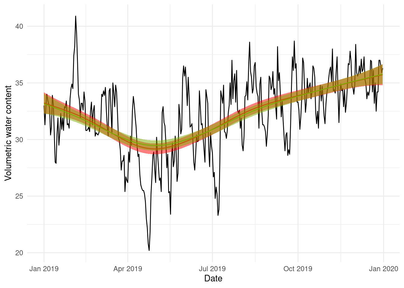 # normally we'd need to construct a prediction data set here and use# the predict() function's newdata= argument, but since we have data for# each day, we don't need to supply that valuetemp <-predict(b0, se=TRUE)bal_2019$pred_b0 <- temp$fitbal_2019$pred_b0_u <- temp$fit +1.96*temp$se.fitbal_2019$pred_b0_l <- temp$fit -1.96*temp$se.fit# note that we can automate this using the pred_with_ci function# in the mgcvUtils package. We'll use that next time...ggplot(bal_2019) +geom_line(aes(x=DATE_TIME, y=COSMOS_VWC)) +geom_line(aes(x=DATE_TIME, y=pred_b0), colour="red") +geom_ribbon(aes(x=DATE_TIME, ymax=pred_b0_u, ymin=pred_b0_l),fill="red", alpha=0.5) +labs(x="Date", y="Volumetric water content") +theme_minimal()